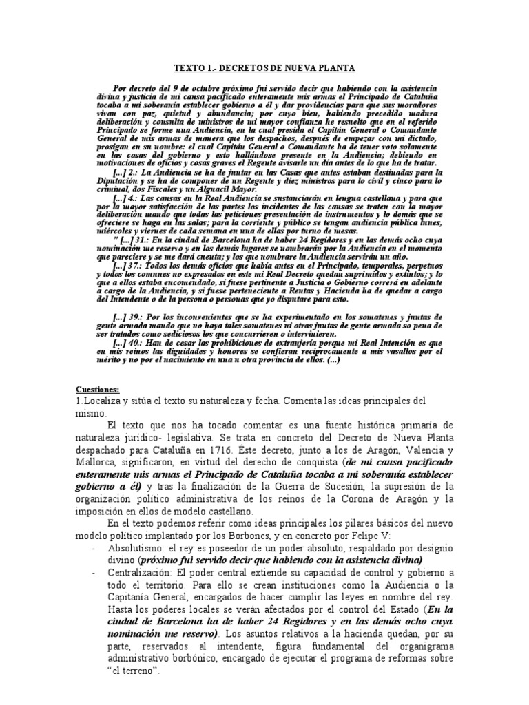 Decreto de nueva planta disposiciones promulgadas por felipe v de castilla, entre 1711 y 1715, sobre nuevo gobierno de aragón y estructuración de su real audiencia. Tipo de texto, circunstancias concretas en las que fue escrito, destino y propósitos por los que se escribió. La época de los primeros borbones, vol. El destinatario del texto es público, ya que es un decreto que se daba a conocer a todos los súbditos de 3. Decreto de nueva planta (comentario de texto)comentario de texto resuelto: